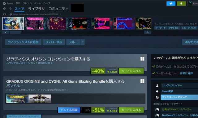 グラディウスオリジンコレクション(Steam版)を購入した。