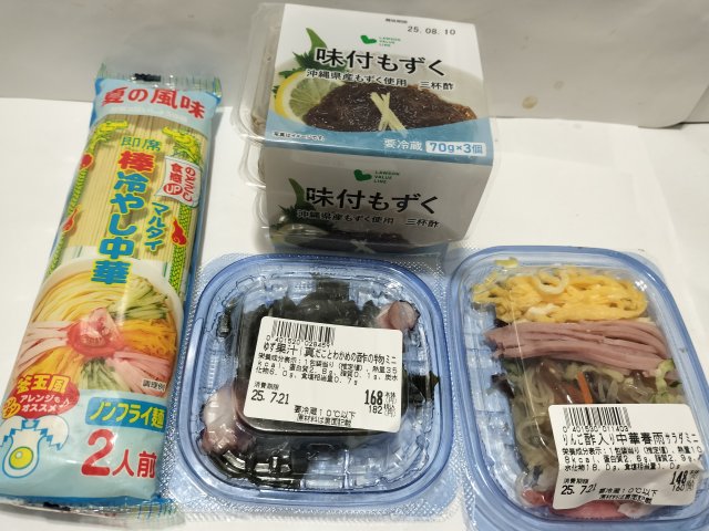 他に、酢を使ったものとして、もずくとかタコの酢の物とか中華サラダ(中華春雨サラダ)をトッピングしてみた。