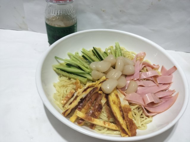 具はいろいろあるが、細切りの肉ともやしが定番で、タレはごまだれみたいな濃いものを掛けて食べるという。