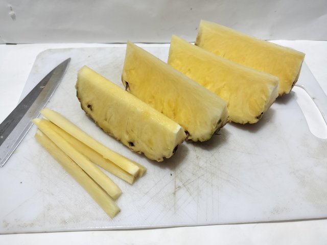 パイナップルの芯の部分は、あまり甘くなくて歯ごたえがあるので具材として使えないだろうか、と思ったので試してみる。
