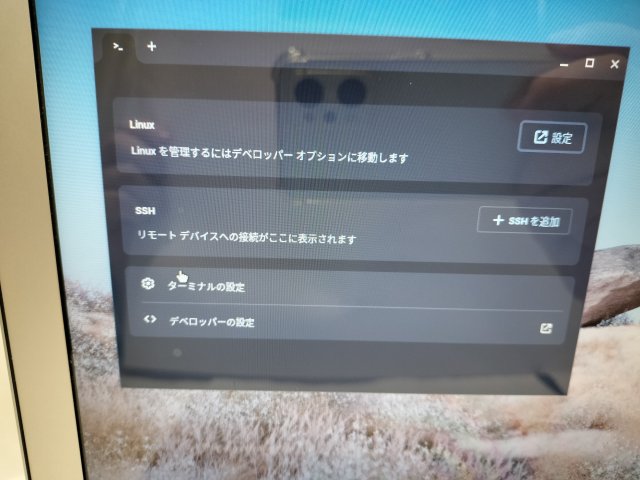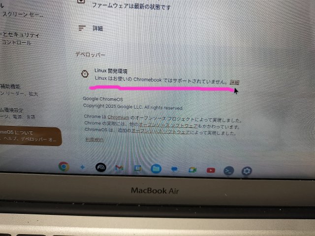 shellを使うために開発者モードに変更しようとしたのだが、できなかった。サポートされていないという表示が出る。(昔のChromeOS Flexではできたらしいのだが、今のバージョンではダメになってしまったようだ。)