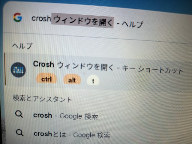 ChromeOS Flexのスタートメニュー的なHelp機能(?)でCroshのキーショットカットを確認すると、ちゃんとctrl+alt+tでcroshが起動する設定になっている。