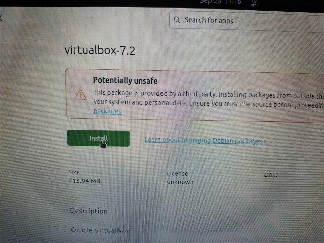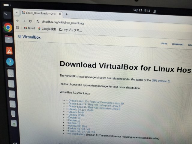 VirtualBox 7.2.2のLinux版のUbuntu 24.04用のやつをダウンロードしてインストールした。