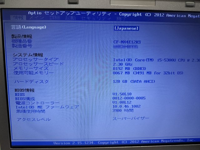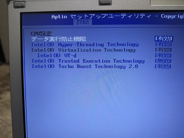 BIOS設定を確認してみたが、セキュリティの設定のところは仮想化関係の機能は表示されているのだが、セキュアブート自体をオフにはできないようだ。EFI bootを無効にして古いBIOS bootに設定は可能だが今回の場合には関係なさそう。