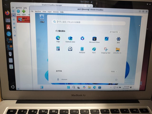 あとは、普通にvirtualbox 7.2.2を起動して、仮想環境でWindows 11を動かすことができた。