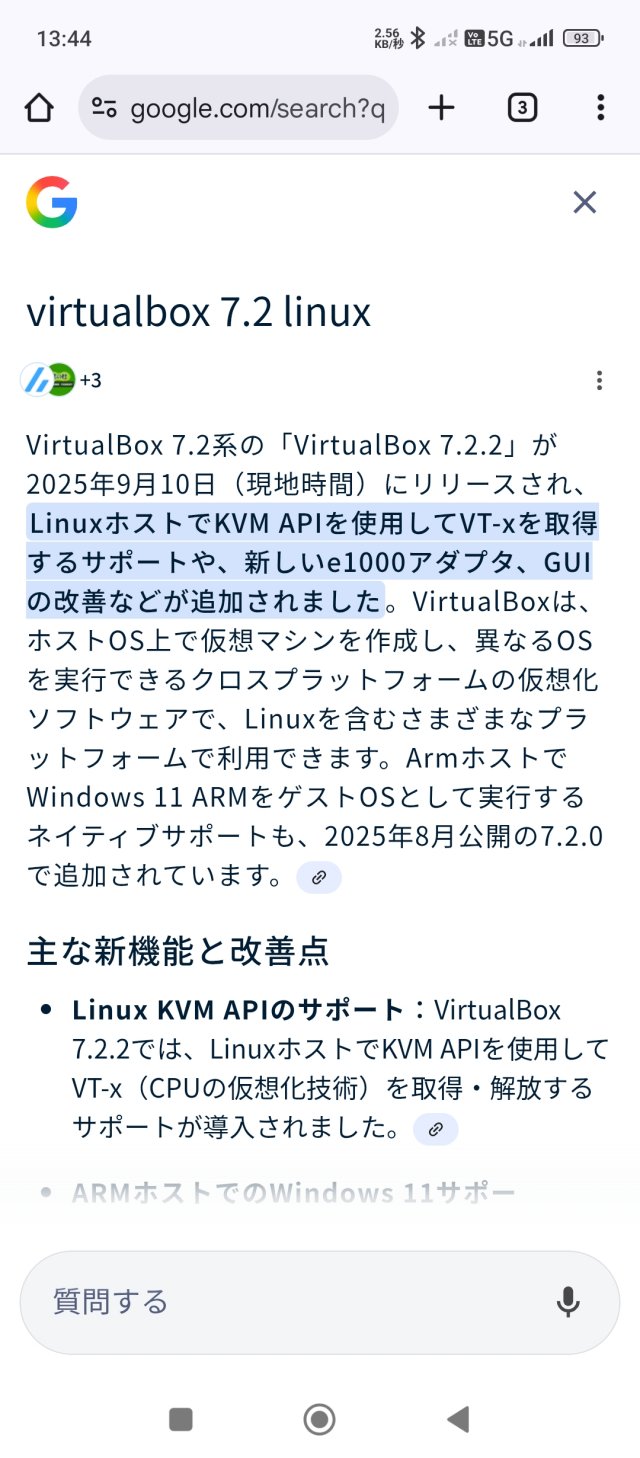 なので、KVMをちゃんと設定すればVirtualbox 7.2.2も動くのだと思って、kvmをインストールして設定するのを試していた。