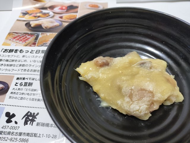 とら豆餅は、芋が餅の生地に練り込んであり、やわらかくて芋菓子っぽい風味の餅だ。とら豆という豆がアクセントになっている。