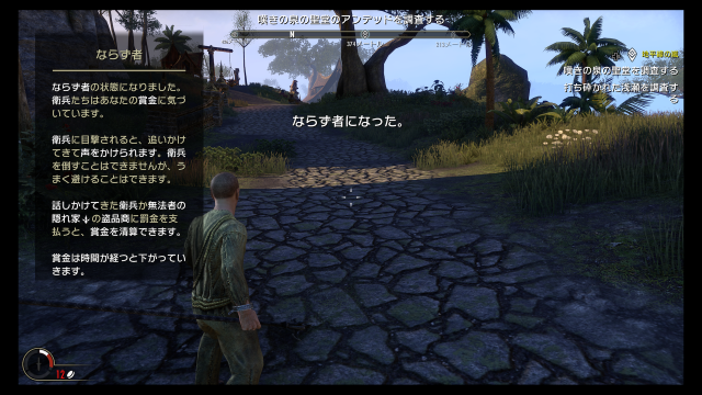 スタート地点の町で、いきなり町の中でNPCを攻撃してしまって衛兵に追われてしまった。設定でNPCなどに攻撃したり泥棒をしない設定にできるので、設定を変更した。