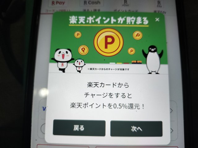 チャージで0.5%のポイントが楽天ポイントで還元される。