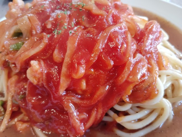 トマトソース部分は、エビの香りがする甘味のあるトマトソース味、ただし、海老の身は刻まれた小さい欠片なのでちょっと食べ応えがなくて寂しく感じる。
