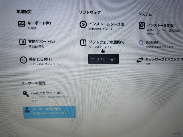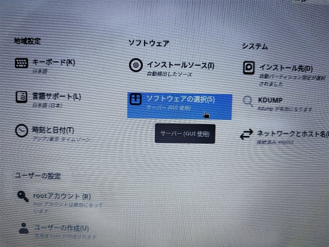 その次の設定がちょっとよく分からなくて、うっかりサーバー版をインストールしてしてしまった。ソフトウェアの選択というところからデスクトップ用のワークステーションという設定にしないといけない。