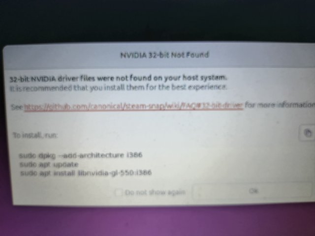 Steamもインストールしたのだが、NVIDIA 32bitのモジュールが足らないという警告がでるので、表示されているとおりにモジュールを手動でインストールした。