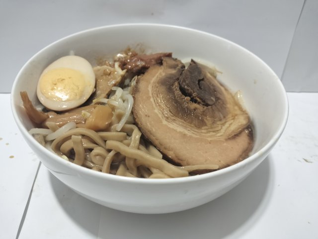 たっぷりの麺のボリュームで食べがいがある。ただし、チャーシューは見た目が大きそうに見えるのだが厚さが1mmくらいの極薄でちょっと寂しい。