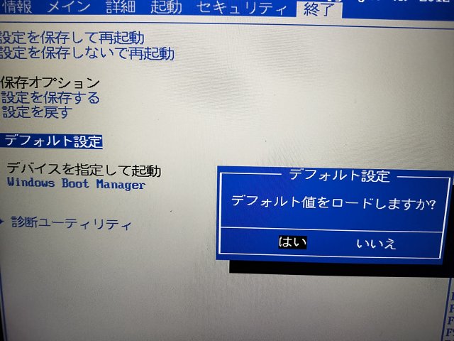 まず、BIOSを「デフォルト設定」というのを選択して、設定をリセットする。