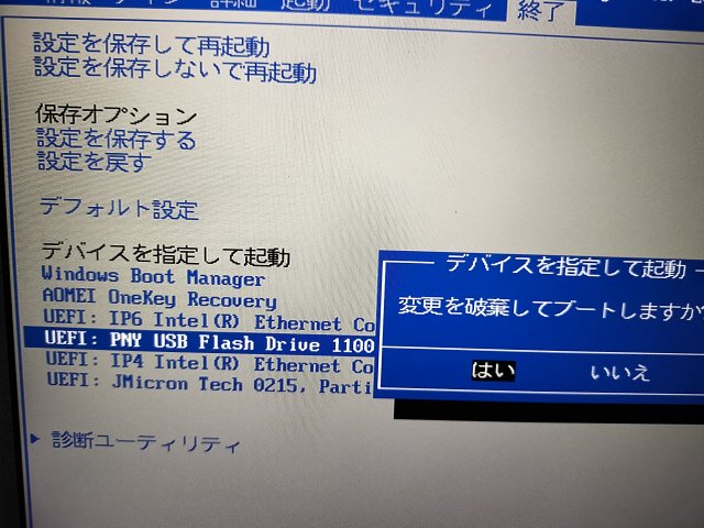 「変更を破棄してブートしますか」と聞いてくるので「はい」を選択する。