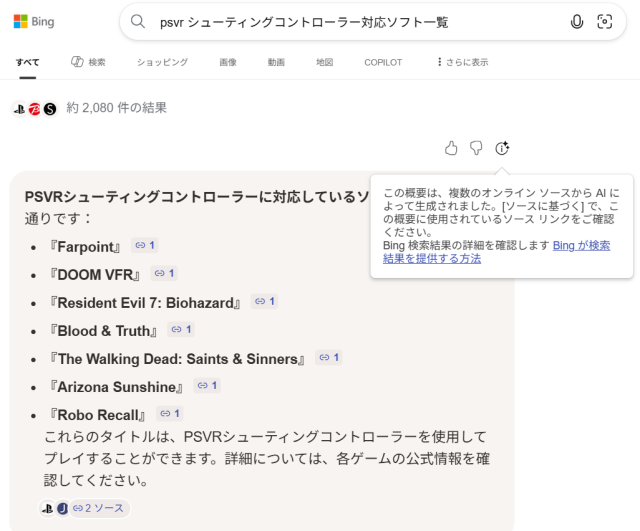 他にも、PSVRのシューティングコントローラー対応ソフトを検索エンジンで調べようとしたら、AIの嘘まとめが表示された……