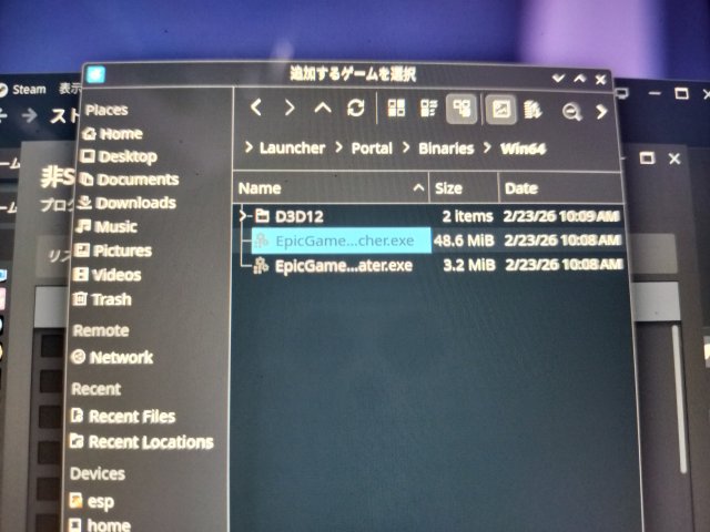 /home/ユーザー名/.local/share/Steam/steamapps/compatdata/数字のフォルダ名/pfx/drive_c/ProgramFiles/EpicGames/Launcher/Portal/Binaries/Win64/EpicGanesLauncher.exeという場所なので、ちょっと長くて面倒だ。