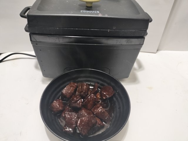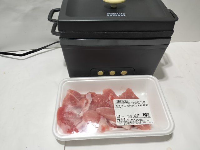 タレに漬けたあと、最初にフライパンで軽く加熱し、低温加熱2Hモードを4回くらい加熱し、最後にフライパンでタレを煮詰めて肉に絡めた。