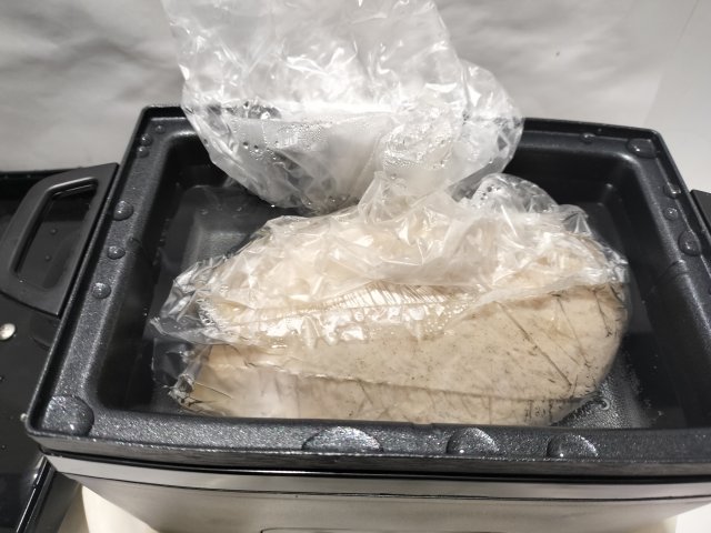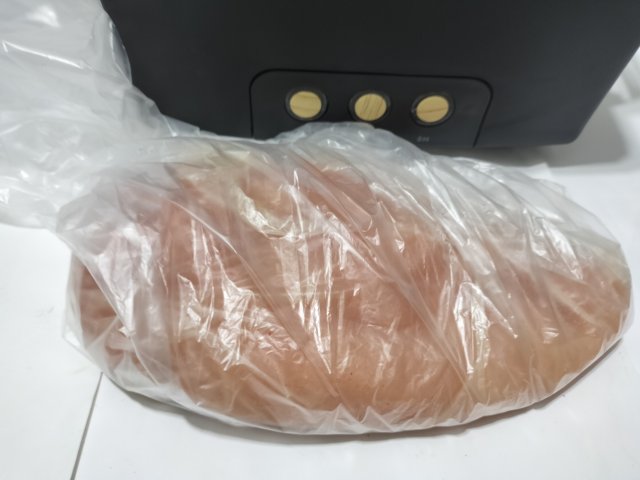 サラダチキンメーカーに水を入れて、袋に入れた鶏肉を水に浸けて、タイマーで加熱する。2Hというボタンで「やわらかモード」の2時間低温加熱となる。