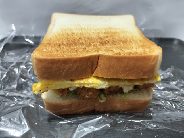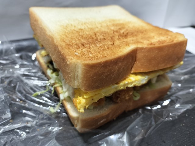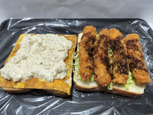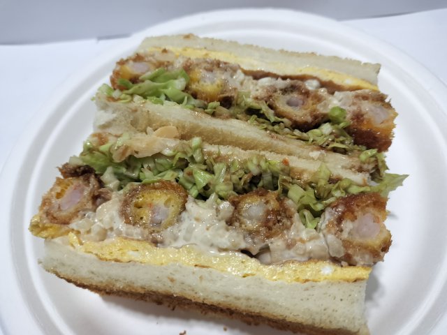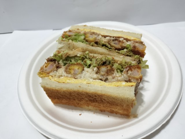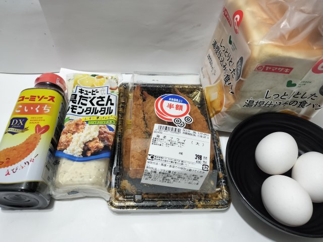 パンを軽くトーストし、具材として、薄く焼いた卵を四角く切ったものと、千切りキャベツと、エビフライのシッポを切り落としたものを用意する。